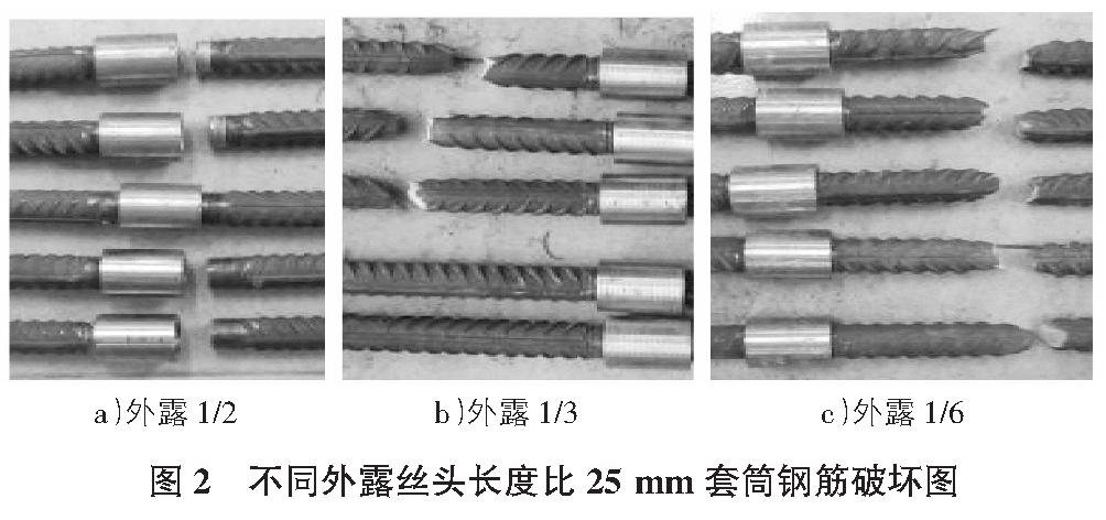 表2 不同外露絲頭長度時,直徑25 mm套筒鋼筋抗拉實驗結(jié)果及破壞形式